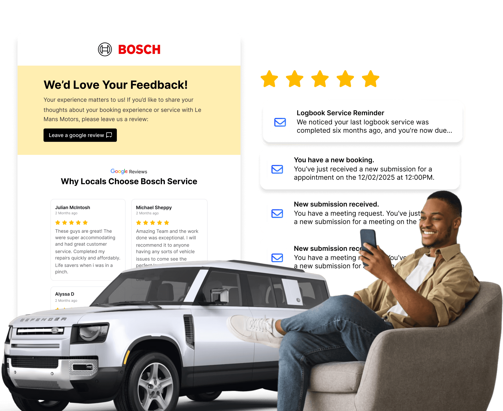 Every completed booking automatically triggers a review request email linking directly to your Google Business profile. More positive reviews improve your local search rankings, making your workshop more visible to potential customers.