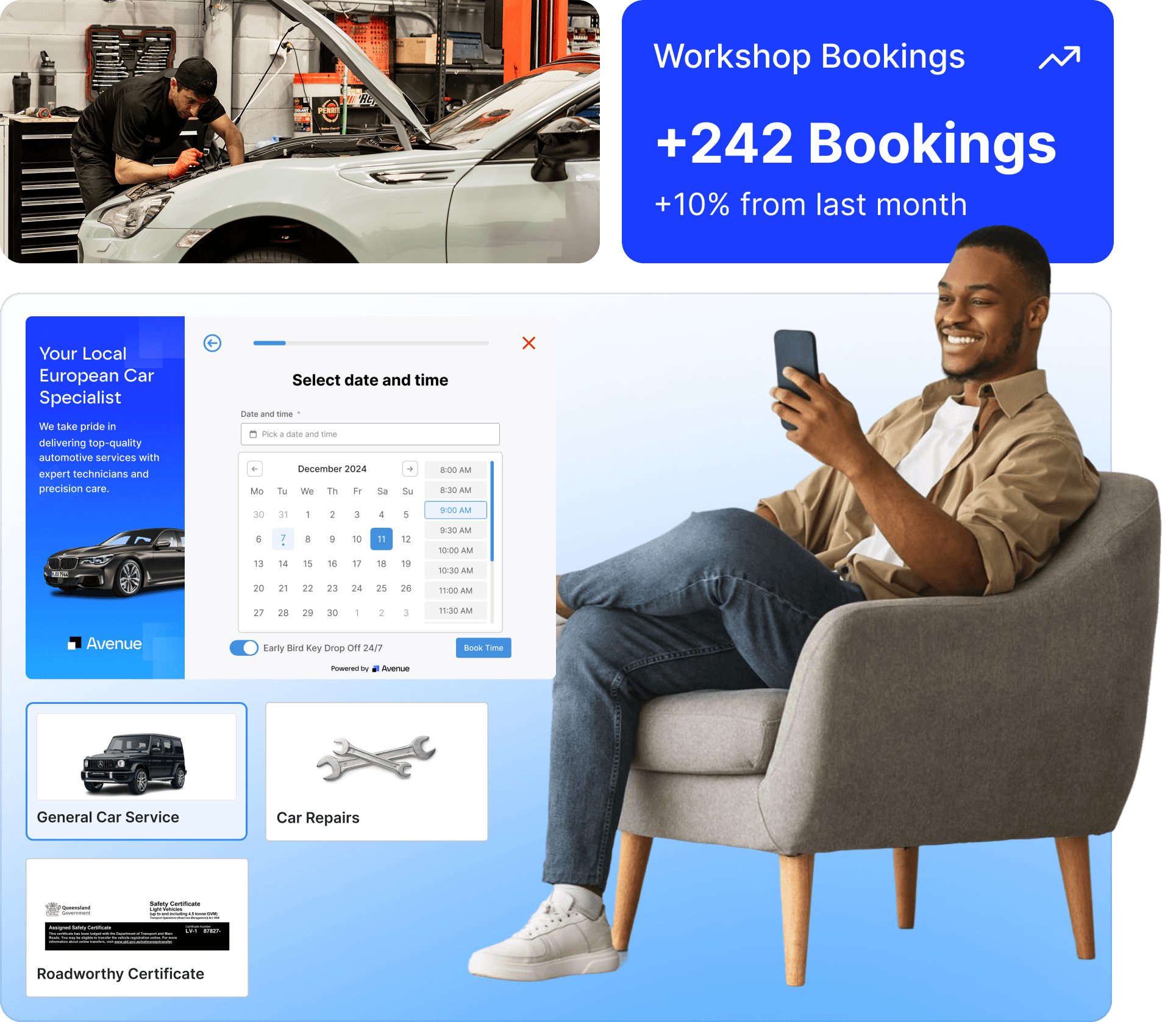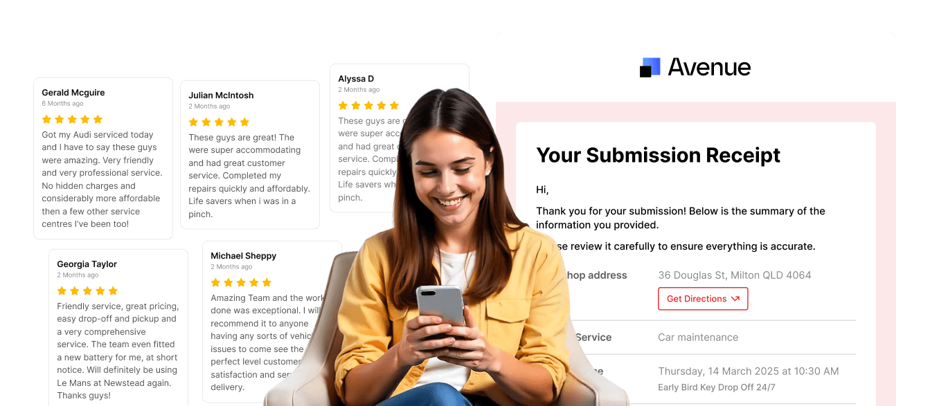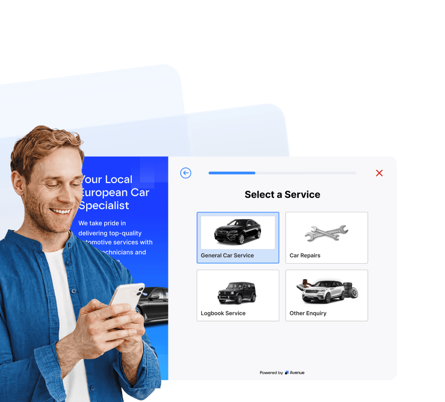 Avenue’s mechanic booking form replaces clunky contact forms and phone runaround with smart booking forms. Customers can book their service in seconds, not phone calls.