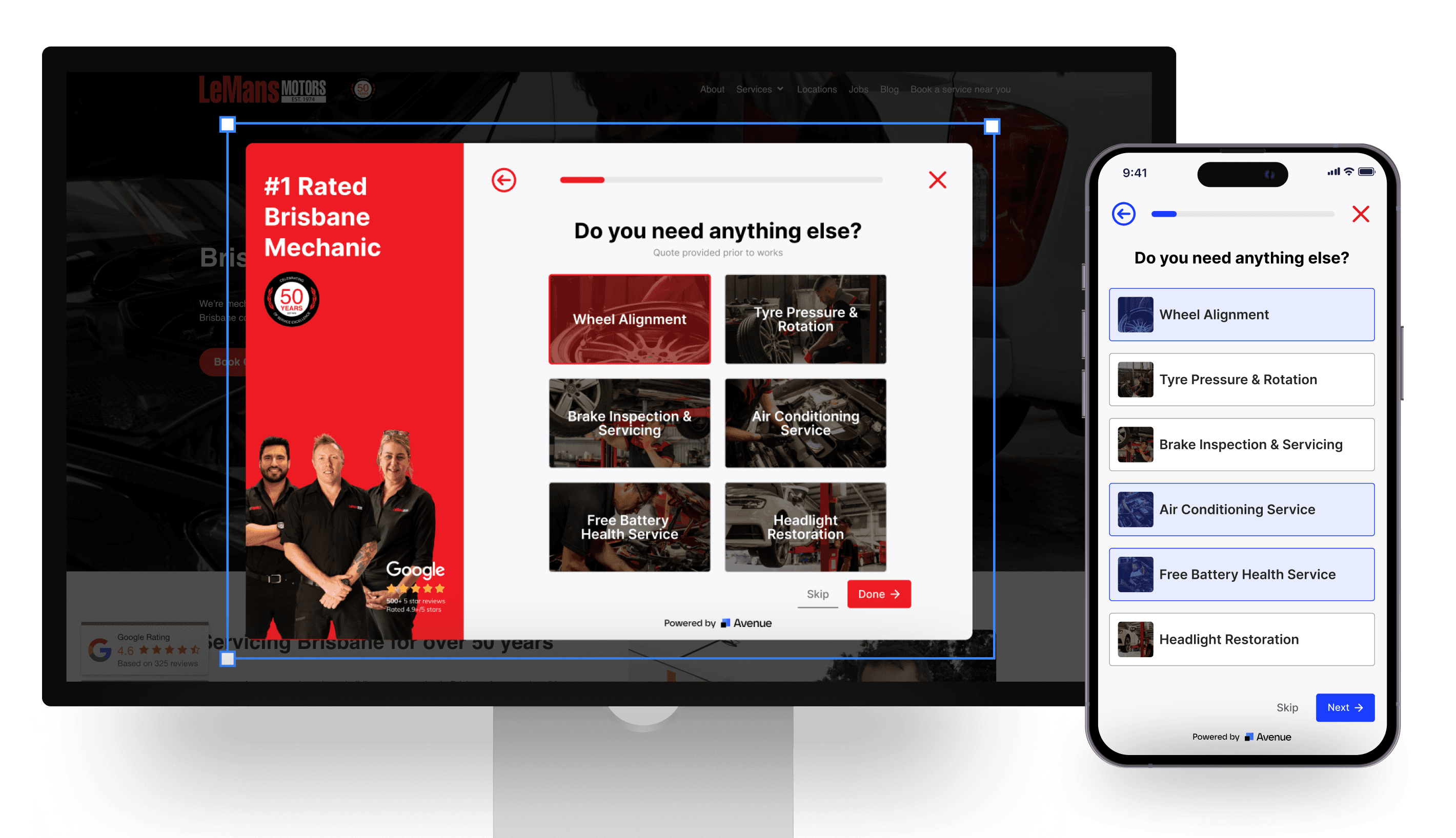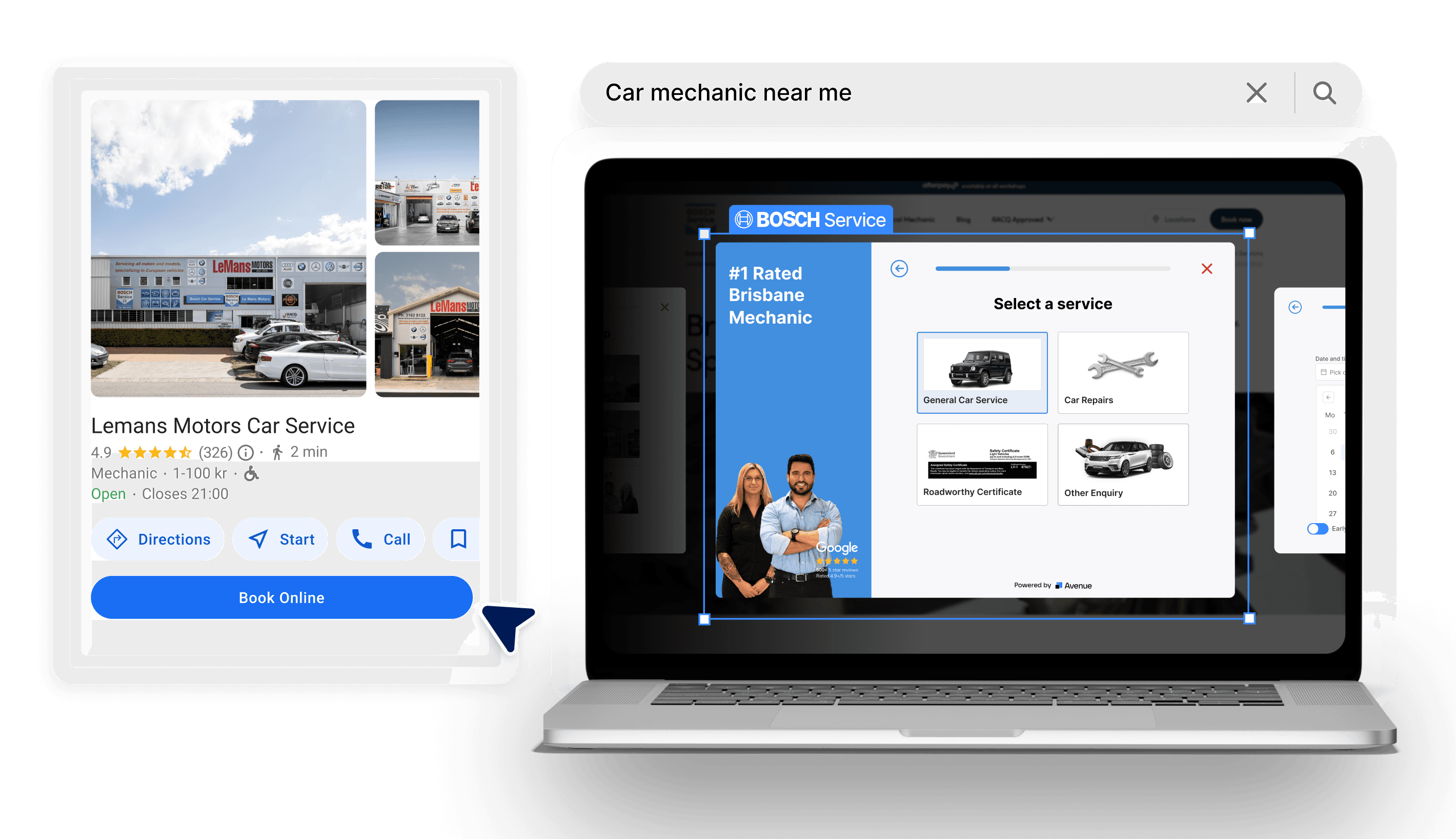 Avenue adds a 'Book Online' button to your Google Profile. Customers can book appointments directly to your mechanic booking form from Google without calling or visiting your website.